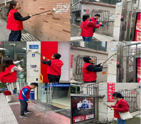 活动现场,志愿者们分工协作、干劲十足。大家手持铲刀、喷壶、抹布等工具,沿着社区主次干道与沿街商铺周边,对墙面、电线杆、公交站牌上张贴的各类小广告及“牛皮癣”进行逐一清理。面对粘贴牢固、难以清除的顽固广告,志愿者们耐心细致地喷洒清洁剂、反复铲除,不放过任何一处卫生死角。尽管清理过程较为烦琐,但大家始终热情饱满,以实际行动为社区环境“焕新颜”。
